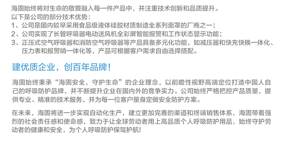 而我國(guó)目前職業(yè)呼吸中毒危害有不斷加重的趨勢(shì),呼吸安全面臨的形勢(shì)將更加嚴(yán)峻。這樣的現(xiàn)狀促使了海固自創(chuàng)立之日起,便帶著強(qiáng)烈的社會(huì)責(zé)任感和使命感,堅(jiān)定不移地?cái)y先進(jìn)理念及高品質(zhì)安全防護(hù)用品進(jìn)入市場(chǎng),消除職業(yè)安全隱患,積極推動(dòng)"安全生產(chǎn)"在中國(guó)各行業(yè)的健康發(fā)展。
