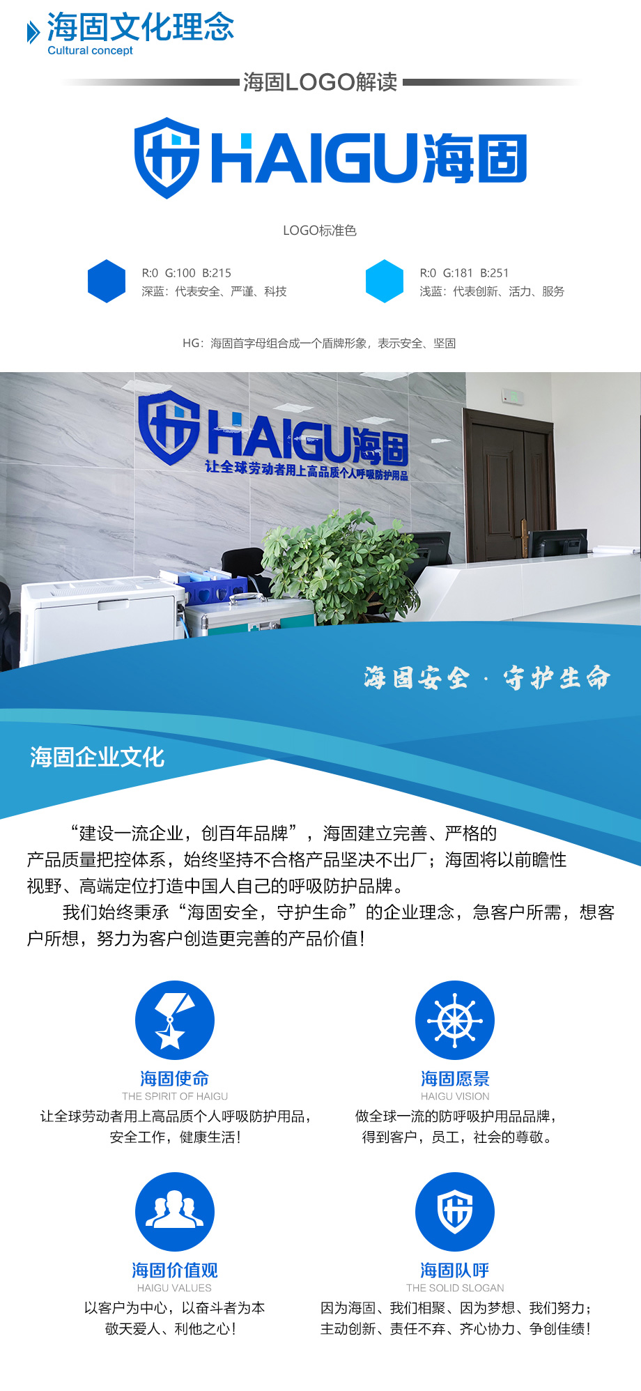 海,廣納百川,盾,固守安全,是海固理念的精髓體現(xiàn)。我們致力于用大海的胸懷引領(lǐng)個(gè)人呼吸防護(hù)用品行業(yè)的發(fā)展方向,以盾的堅(jiān)固作為防護(hù)用品研發(fā)的核心理念,為用戶提供科學(xué)專(zhuān)業(yè)、有針對(duì)性的PPE個(gè)體安全防護(hù)方案,追求成為具有國(guó)際化水準(zhǔn)的職業(yè)防護(hù)解決方案供應(yīng)商。