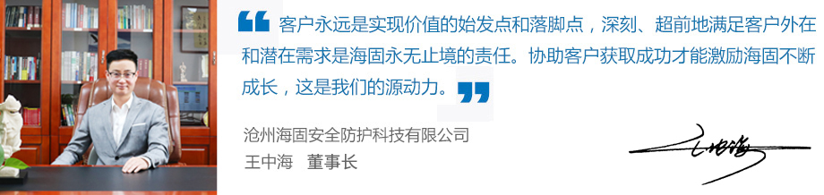 "建優(yōu)質(zhì)企業(yè),創(chuàng)百年品牌",海固建立完善、嚴(yán)格的產(chǎn)品質(zhì)量把控體系,始終堅(jiān)持不合格產(chǎn)品堅(jiān)決不出廠;銷(xiāo)售過(guò)程中提供專(zhuān)業(yè)精準(zhǔn)的技術(shù)服務(wù),為每一位客戶量身定做符合工作需求的防護(hù)方案。同時(shí),海固公司植根本土,放眼國(guó)際,以創(chuàng)新性前沿科技不斷提升企業(yè)競(jìng)爭(zhēng)實(shí)力。